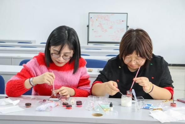 活动现场温馨雅致,器具齐备,色彩斑斓。在专业老师的指导下,大家按照配比混合原料、加热搅拌、注入模具……一步步体验从无到有、由手入心的创作乐趣。伴随着淡淡的精油香气,一支支独具个性的口红悄然成型,也点亮了每一位参与者脸上的笑容与自信。
