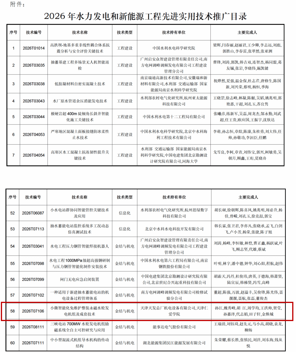 近日,中国水力发电工程学会公布了2026 年水力发电和新能源工程先进实用技术推广目录。本次先进实用技术评选旨在推动水力发电和新能源工程行业积极采用先进实用技术,有效提高行业科技水平,进一步促进新阶段水电和新能源行业高质量发展。中国水力发电工程学会组织开展了2026年水力发电和新能源工程先进实用技术的征集、评审工作,经严格筛选,形成了《2026年度水力发电和新能源工程先进实用技术推广指导目录》。全国共入选71项,由天津天发总厂机电设备有限公司和我校绿色水电研究院联合申报,天津仁爱学院领军人才、绿色水电研究院首席研究员孙江教授作为项目主持人的《小微智能化免维护整装永磁水轮发电机组及成套技术》成功入选,是天津市唯一入选项目。