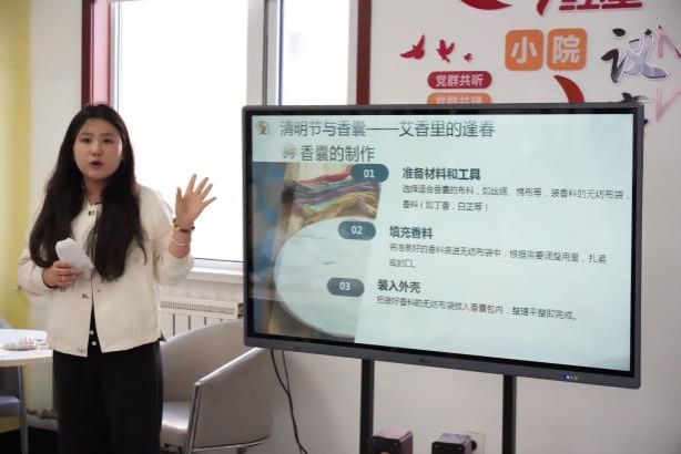 活动伊始,志愿者代表朱嘉怡为社区青少年系统梳理了清明节的历史沿革与文化内涵,重点讲解了传统中药香囊的制作技艺及其药用价值。在志愿者的悉心指导下,家长与孩子们默契协作,一枚枚饱含春意与祝福的香囊应运而生,让非遗技艺在指尖焕发新生。