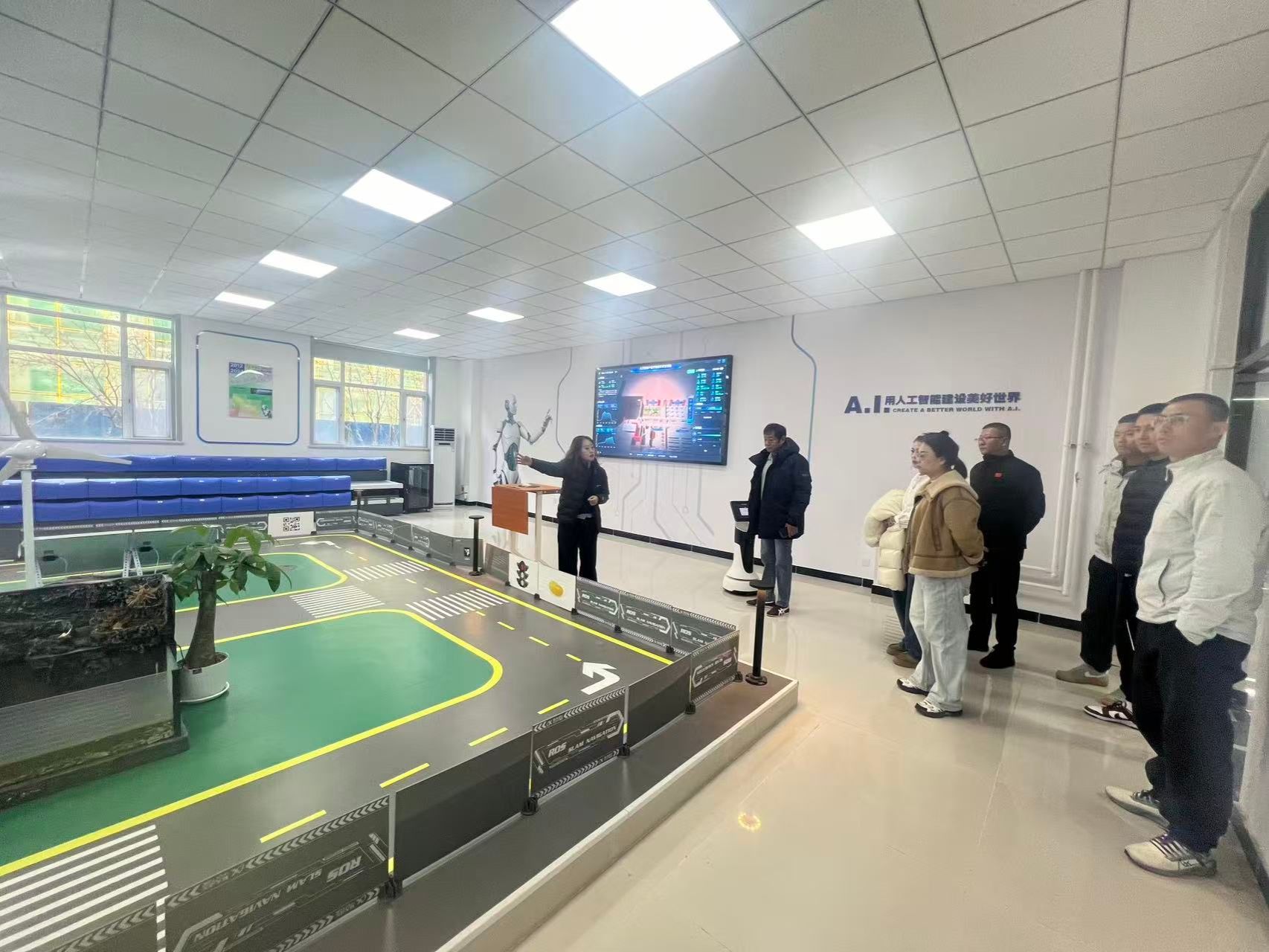 首先赴智算工程学院参观科大讯飞实践基地,详细了解数字人、导览机器人等学生项目及AIOT实训台。