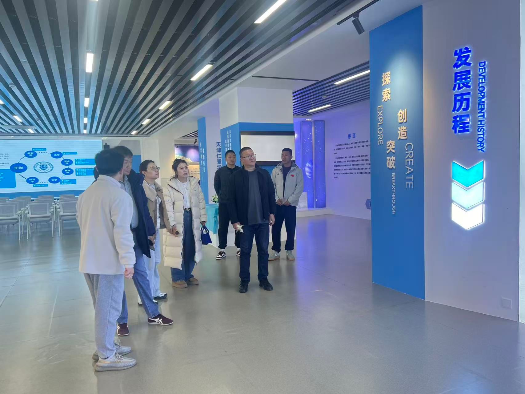 创新创业学院带领领导老师参观竞赛测试区、众创空间等功能区域,介绍学校创新创业教育发展历程、导师团队及合作成果。