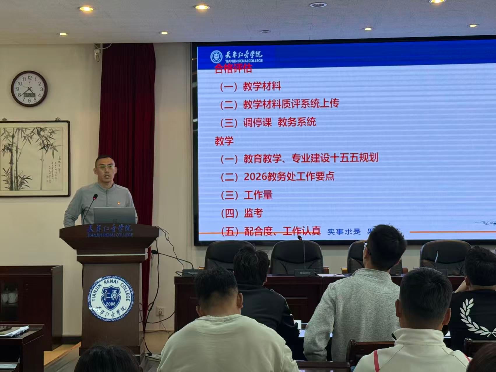 院长助理韩孟就教学管理与本科教学合格评估专项工作作出细化部署。他提到,全体教师要严格规范教学材料整理归档与教学质量评价系统上传工作,严肃执行调停课管理规定,确保各项教学档案完整规范、符合要求。第二,要统筹做好日常教育教学安排、实验室教学管理、教师工作量考核、考务监考组织等常规教学工作,确保教学运行平稳有序。第三,要持续深化公共体育教学体系优化升级,加快推进AI智慧课程改革与建设工作,以教学改革创新赋能人才培养质量持续提升。