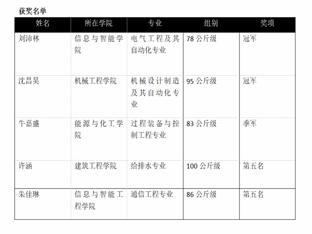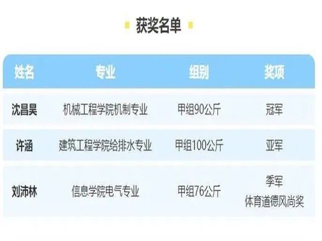 2023年8月6日至12日,第七届中国大学生武术散打锦标赛在哈尔滨市师范大学体育馆开赛。我校散打队4名参赛队员荣获一金、一银、一铜的好成绩,刘沛林荣获“体育道德风尚奖”,吕振广教练荣获“优秀教练员奖”。