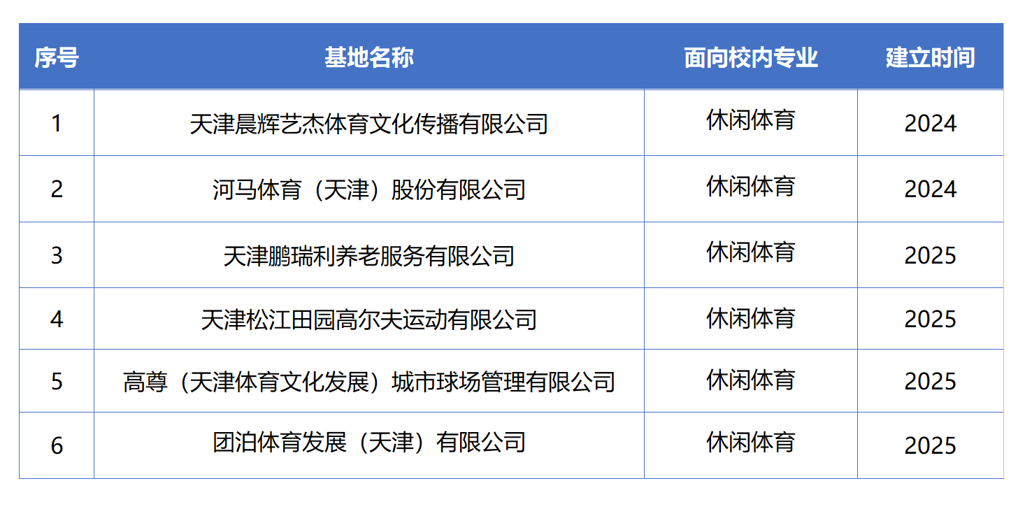 学院不断拓展校外实习实训平台,目前已与6家单位共建基地,2025年与天津市静海区体育局达成战略协议,并与天津团泊体育产业有限公司、天津鹏瑞利养老康护社区等建立合作关系,有效满足学生实践创新能力提升和应用型人才培养需求。(数据统计截止至2026年3月)
