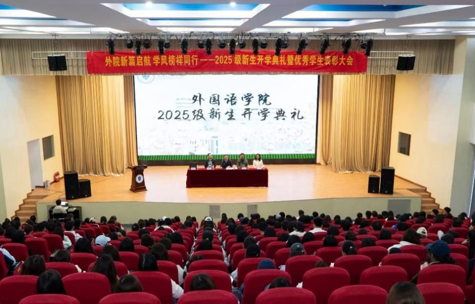 夏色渐敛,已赴秋实之时,在这充满诗意的季节里,外国语学院于2025年10月10日下午在大学生活动室隆重举行了2025级新生开学典礼,本次开学典礼以“外院新篇启航 学风榜样同行”为主题。旨在明确新学期的奋斗目标,营造浓厚的开学氛围,树立榜样形象,激励外国语学院师生以崭新的面貌与昂扬的斗志,共同开启新的征程。