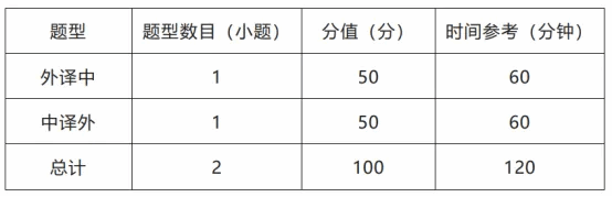笔译试卷满分为100分,时间为120分钟,共2种题型2道题,全部为主观题。参赛选手可使用中译外、外译中纸质版词典各1本。