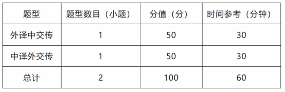 口译试卷满分为100分,时间为60分钟,共2种题型2道题,全部为主观题。