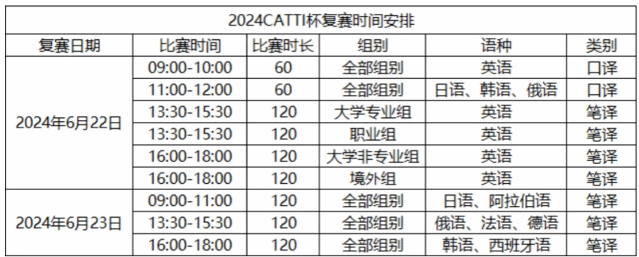 根据大赛组委会的通知,现就2024年“CATTI杯”翻译大赛复赛、决赛时间通知如下:
