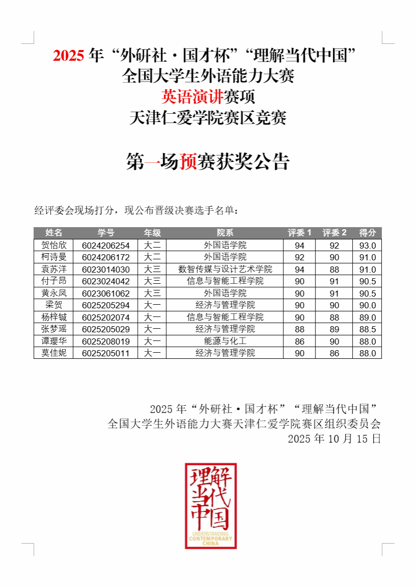 2025"理解当代中国"演讲第1场校预赛获奖公告