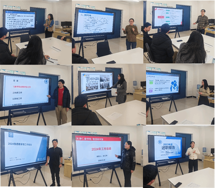 随后,每位教职工按照顺序进行了述职,内容涵盖教学、科研、指导学生和行政等方面。例如:李育洁老师分享了教学过程中采取的课堂活动类形和方法。何伟岩老师分享了天津市普通高校大学物理竞赛的获奖情况和班主任工作的相关经验。韩彬老师作为支部书记,对部门的主要支部活动进行了总结,并重点汇报了申请立项《大学物理1》课程思政示范课。部门唯一的双师型教师袁泉在项目申请立项和论文发表给出了详细汇报,并展示了丰富的教学、科研和其他相关工作内容。王悦老师对行政工作方面的安排进行了详细汇报。王可蒙老师介绍了自己在教学创新方面的尝试,如采用翻转课堂模式,提升学生的学习兴趣。杨平老师汇报了自己的教学内容,并尝试用Matlab攥写了相关脚本,提高教学质量。实验室管理员王士福对物理实验中心的设备更换和采购进行了汇报。新入职四位教职工许江华、李盼云、孙瑞和郭棣,入职时间不满六个月(2024年7月1日及以后入职),对入职后的工作做了简单汇报,分享了自己的一些入职心得。此外,教师们也都对2025年教学工作、教学竞赛、教改项目和科研项目方面做出了简单规划。