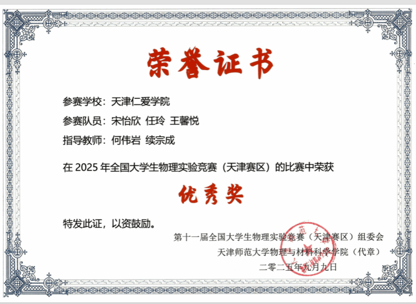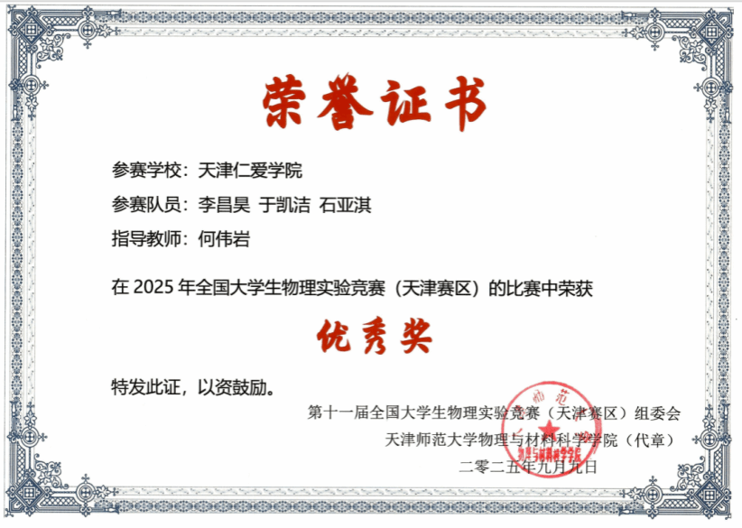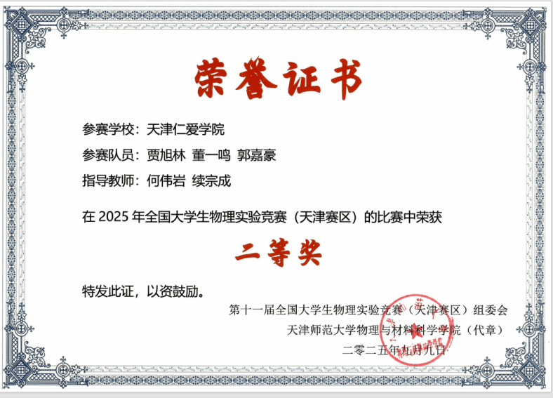 喜报!我校学子在2025全国大学生物理实验竞赛(天津赛区)比赛中获二等奖