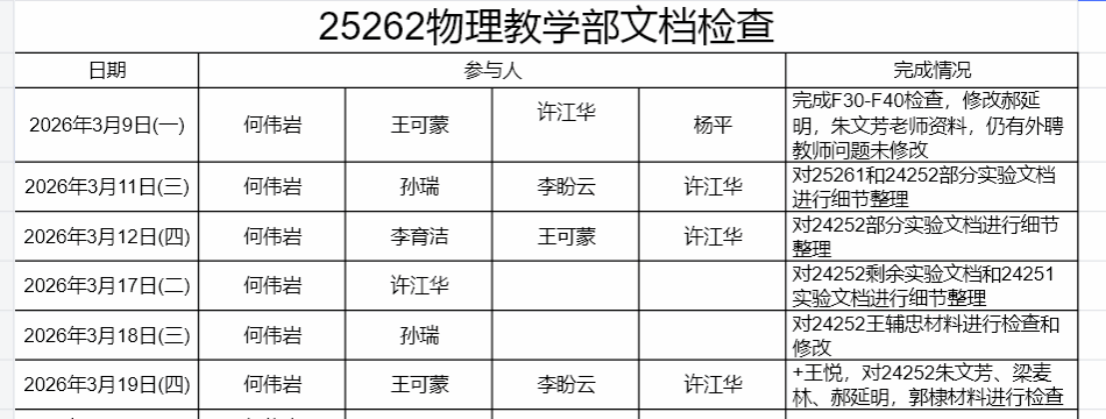 为进一步规范教学管理流程,强化教学档案建设,保障新学期教学工作有序高效开展,物理教学部精心组织、周密部署,全面开展教学文档专项检查工作。本次检查以“全覆盖、严标准、重实效”为原则,通过分组核查、逐项梳理、集中反馈的方式,对部门各类教学文档进行细致排查与梳理,有效提升了教学文档管理的规范化、标准化水平,为物理学科教学质量稳步提升筑牢基础。