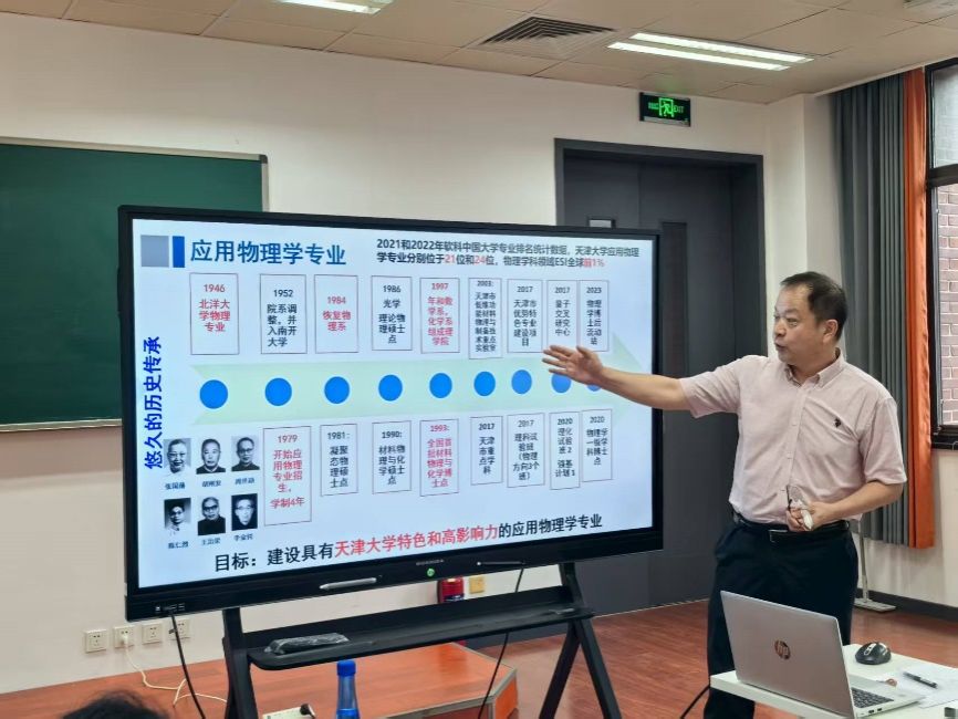 在学科建设方面,他回顾了应用物理学专业的发展历程,重点阐述了凝聚态物理、光学等主要研究方向,并分享了具有天津大学特色的创新人才培养模式。