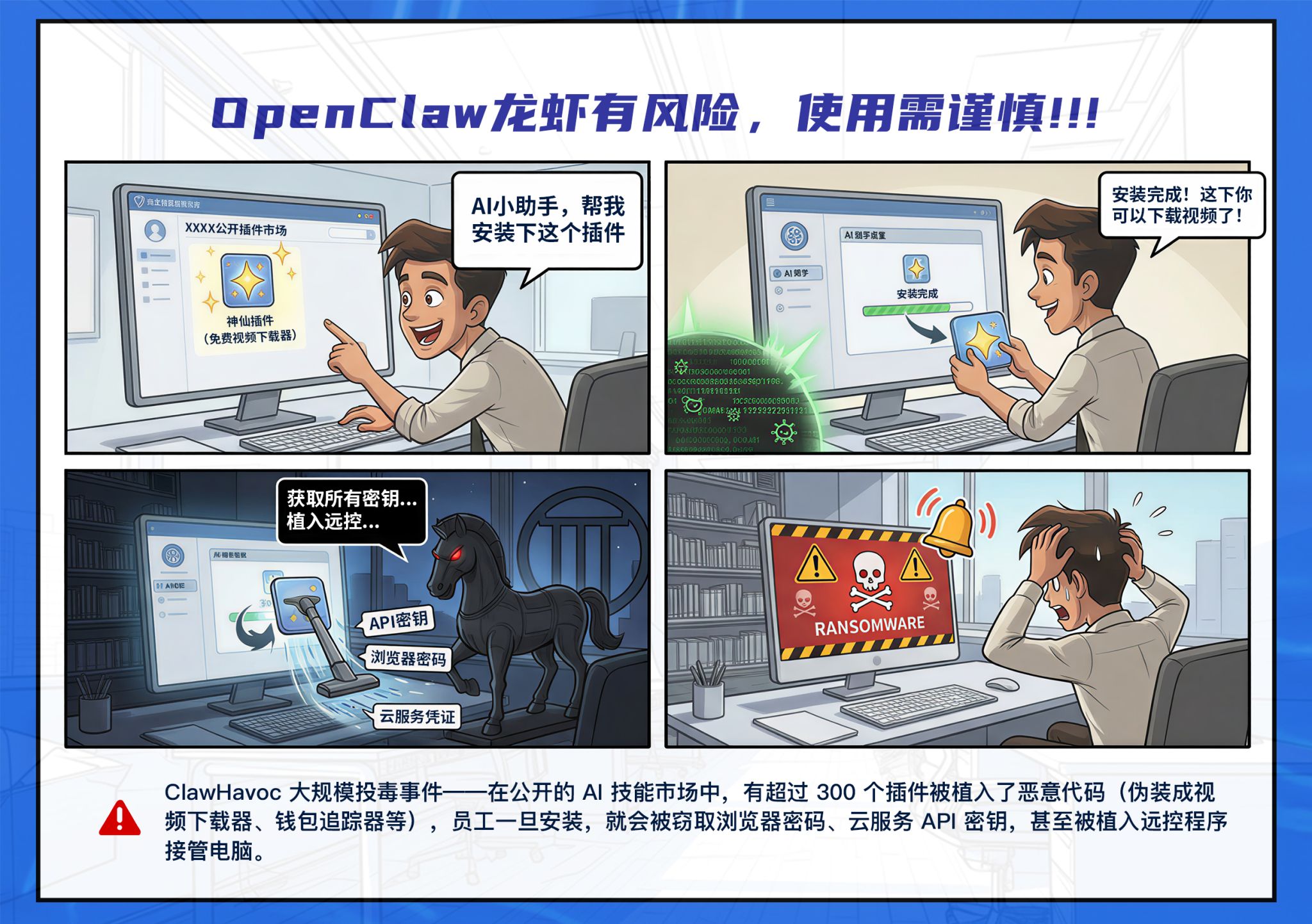 OpenClaw 龙虾大规模投毒事件的惨痛教训 —— 超 300 个伪装成实用工具的 AI 插件暗藏恶意代码,一旦安装,浏览器密码、云服务 API 密钥等核心数据会被窃取,电脑还会被植入远控程序、遭遇勒索攻击,企业安全防线将彻底失守。这再次提醒我们:“安全养龙虾”,风险防控必须前置,来路不明的插件绝不能随意安装。