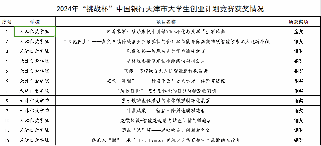 我校在2024年“挑战杯”中国银行天津市大学生创业计划竞赛中喜获佳绩!我校斩获市级金奖1项、银奖2项、铜奖9项,获奖总数12项。其中,“净界革新:喷动床技术引领 VOCs 净化与资源再生新风尚”在此次市级竞赛中获得金奖并被推荐参加国赛。