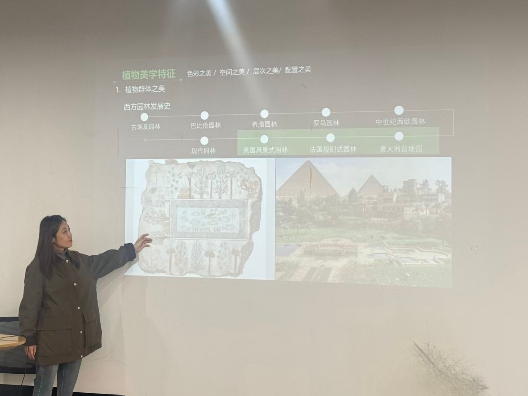 周烨老师通过《退思园》与《凡尔赛宫》两部纪录短片引入,将植物美学与影像表达巧妙融合,启发大家思考中西方园林在设计理念与植物配置上的差异。她从植物群体景观的角度,系统梳理了西方园林的三大体系——意大利台地园、法国图案式园林与英国自然风景园;随后聚焦个体植物的审美表达,结合《卧虎藏龙》《英雄》《影》等影片的经典镜头与片段,从植物形态、色彩、声音与意境四个维度,深入阐释了中国古代私家园林的设计精髓。同学们在视听交织的体验中,沉浸式感受中国园林文化的隽永魅力。