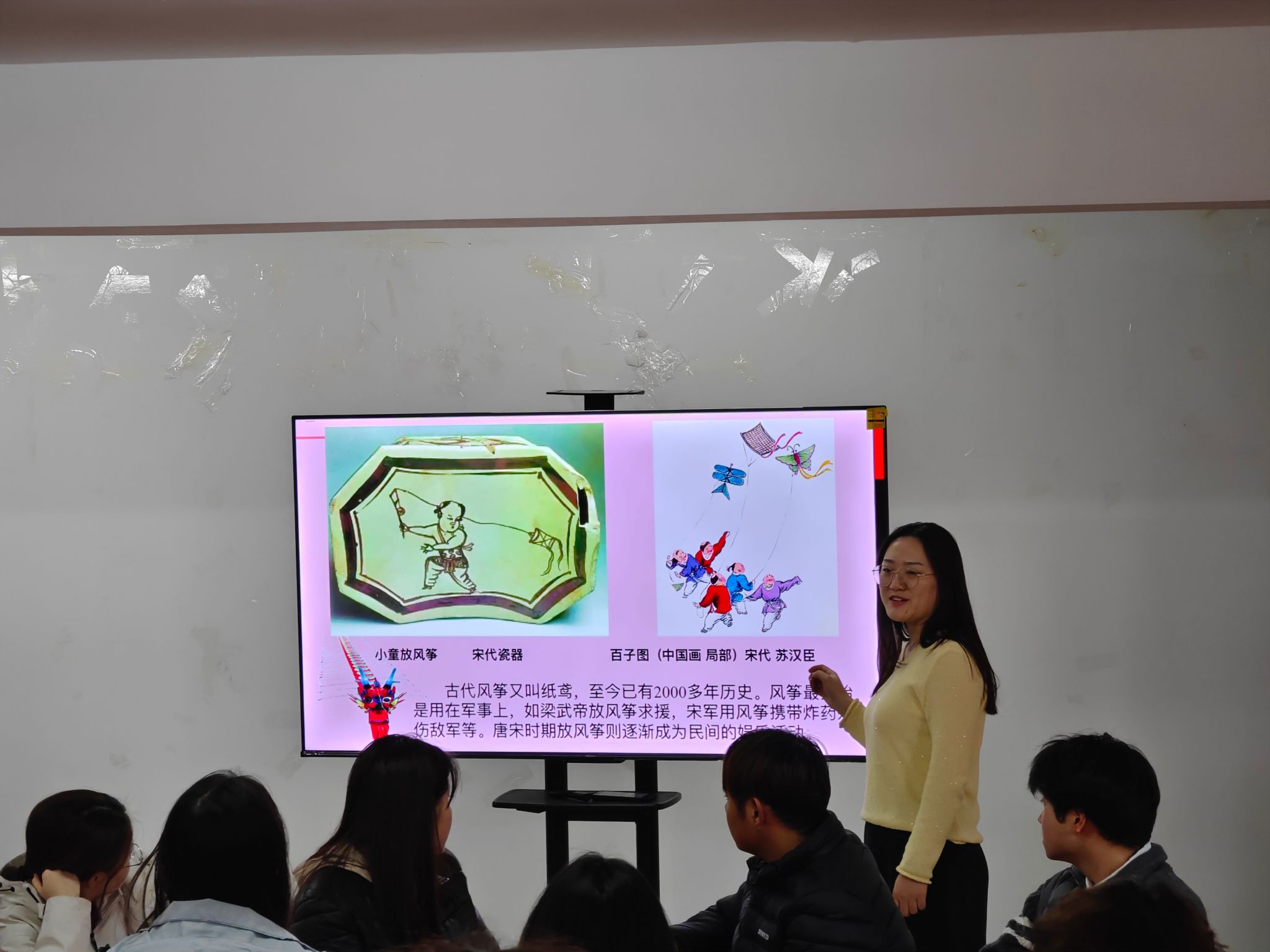活动现场,范老师先为同学们讲述了风筝的起源与民俗文化内涵,从江南纸鸢的婉约造型到北方沙燕风筝的灵动设计,结合美学构图、色彩搭配知识,为大家讲解风筝绘画的技巧与创意思路。随后,同学们纷纷拿起画笔、调色盘,发挥想象自由创作。