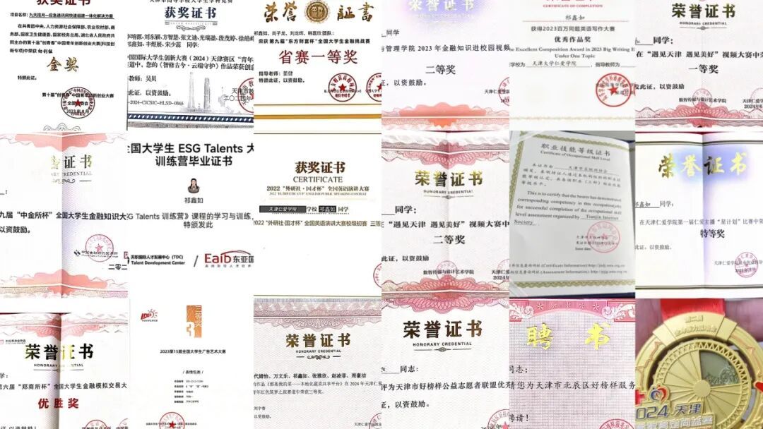 祁鑫如成绩排名达到专业第一,90%的课程成绩在90分以上,20门课程取得满绩点。在校期间参与竞赛与活动36次,获得奖项及荣誉28项。