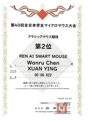 2025年11月9日,第40届全日本学生微鼠大赛(All Japan Micromouse Contest for Students)在日本东京理科大学野田校区成功举办。本次大赛由东京理科大学承办,吸引了来自全球多所高校的98支队伍参赛。天津仁爱学院信息与智能工程学院“REN AI SMART MOUSE”团队代表陈婉茹同学在董丽元老师指导下凭借出色发挥,以6.622秒的优异成绩,荣获古典智能鼠赛项第二名、古典智能鼠特别奖以及日本机器人学会学生特别奖三项大奖,展现了天津仁爱学院在人工智能与机器人领域的卓越育人成果。