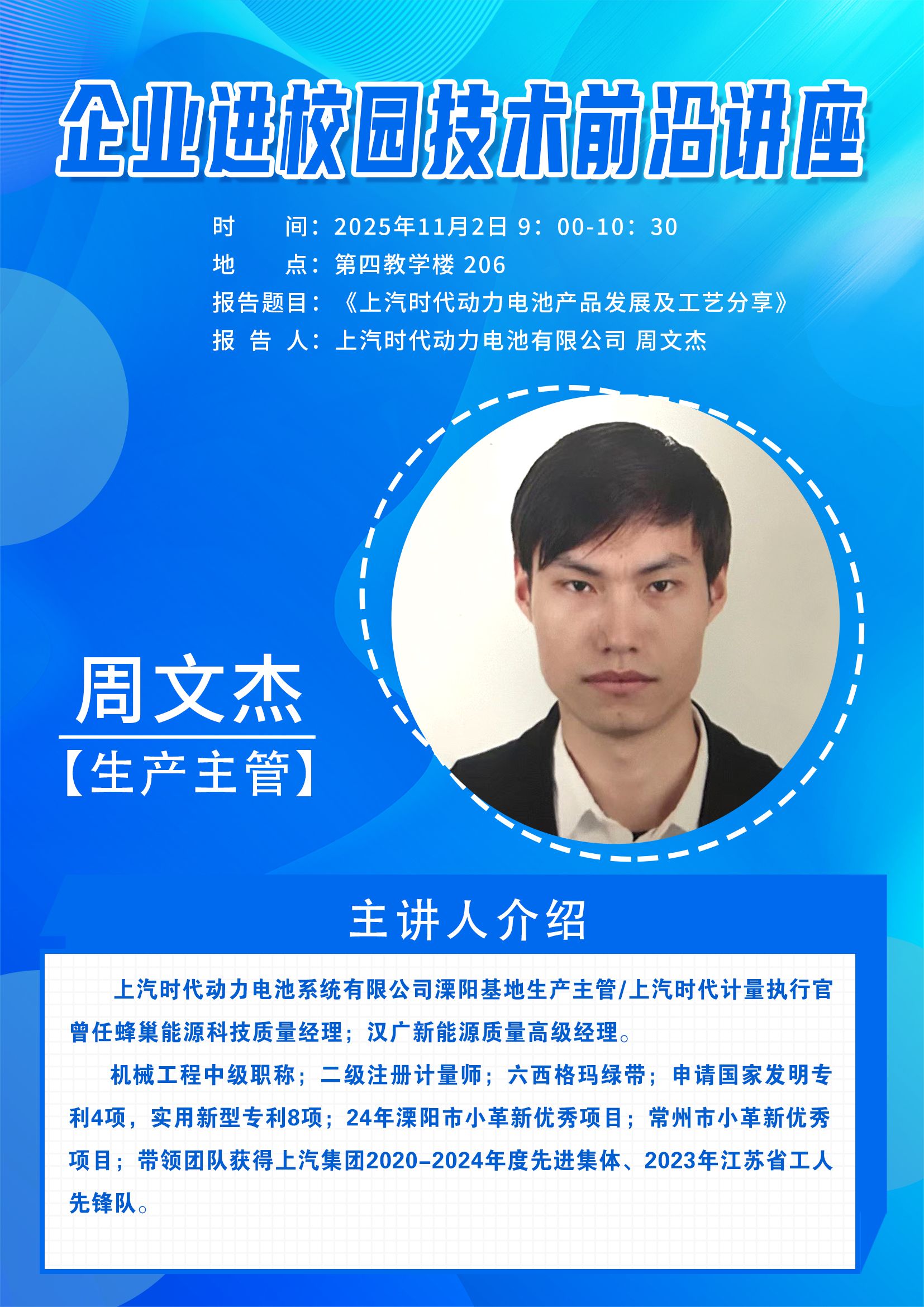 报告题目:《上汽时代动力电池产品发展及工艺分享》报告人:上汽时代动力电池有限公司周文杰