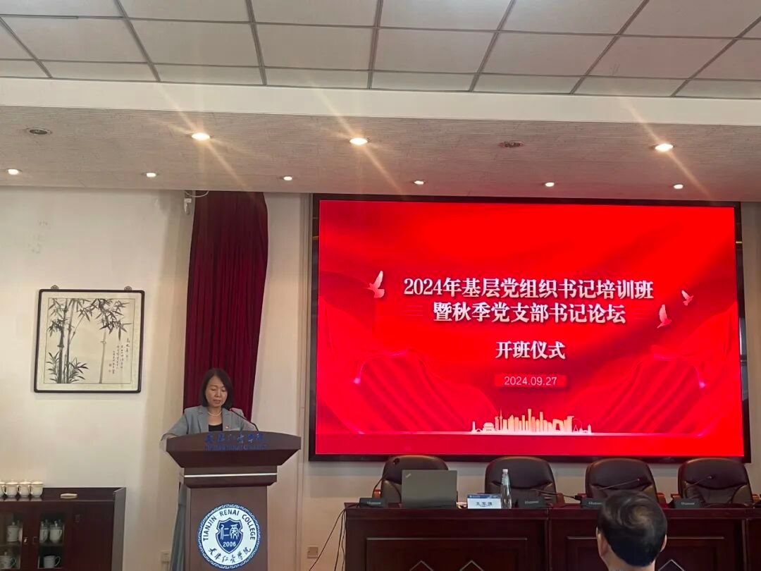 为深入学习贯彻党的二十大精神和党的二十届一中、二中、三中全会精神,贯彻落实新时代党的建设总要求及新时代党的组织路线,全面落实习近平总书记视察天津重要讲话精神和全国教育大会精神,提升学校基层党组织政治功能和组织功能,强化基层党组织书记理论武装、提高履职能力,聚焦“示范高校”建设,全面提升学校党建工作水平,为学校事业发展提供思想保证、政治保证和组织保证。天津仁爱学院于2024年9月27日举行2024年基层党组织书记培训班暨秋季党支部书记论坛开班仪式,并邀请天津大学马克思主义学院王军旗教授做题为《强国建设、民族复兴的康庄大道》首场报告。全体党总支书记、副书记,党支部书记及组织员参加此次培训,培训由学校党委副书记李霞主持。