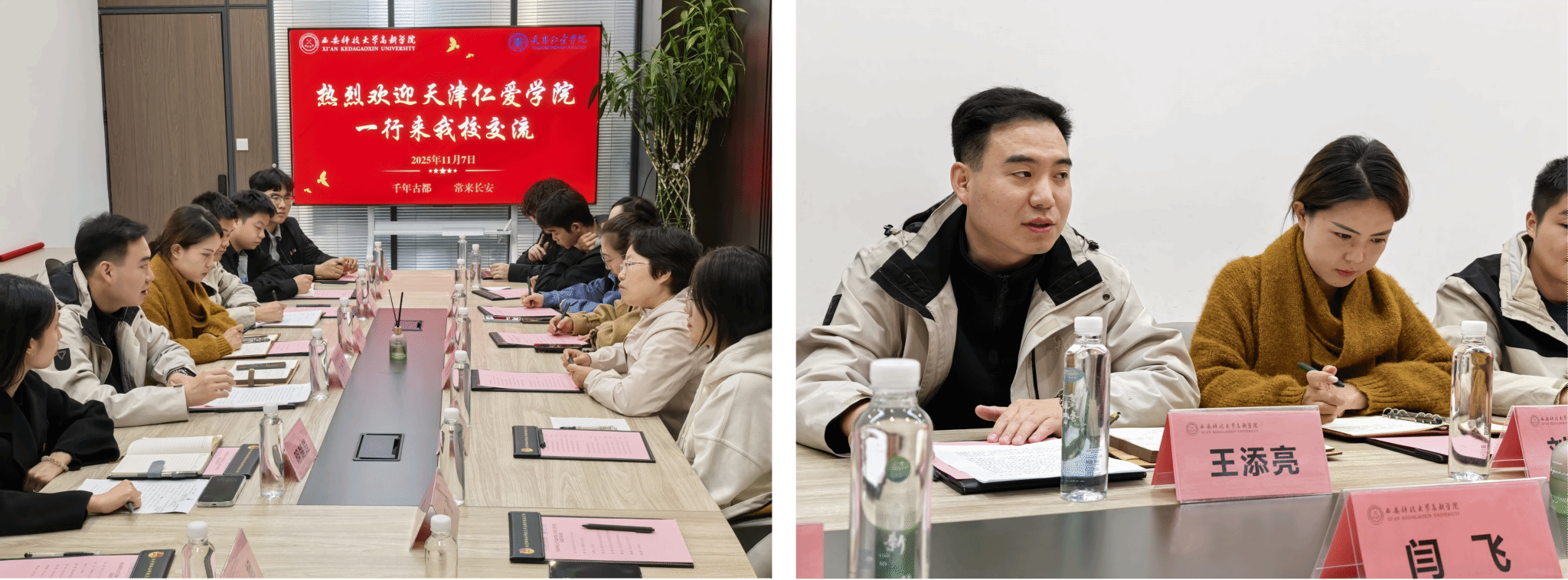当日下午调研小组抵达西安科技大学高新学院,在校友、该校团委副书记王添亮的组织下与校方相关负责人开展专题交流活动。校国际教育与人文学院院长助理刘洋、校社团管理中心主任明楚楚,以及该校相关部门老师、学生代表共同参与了此次专题交流会。