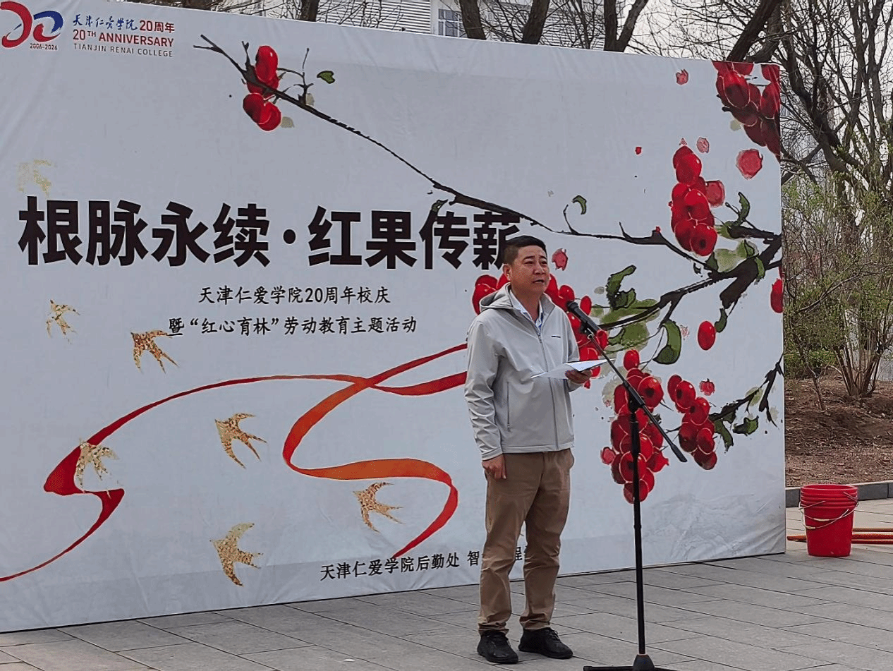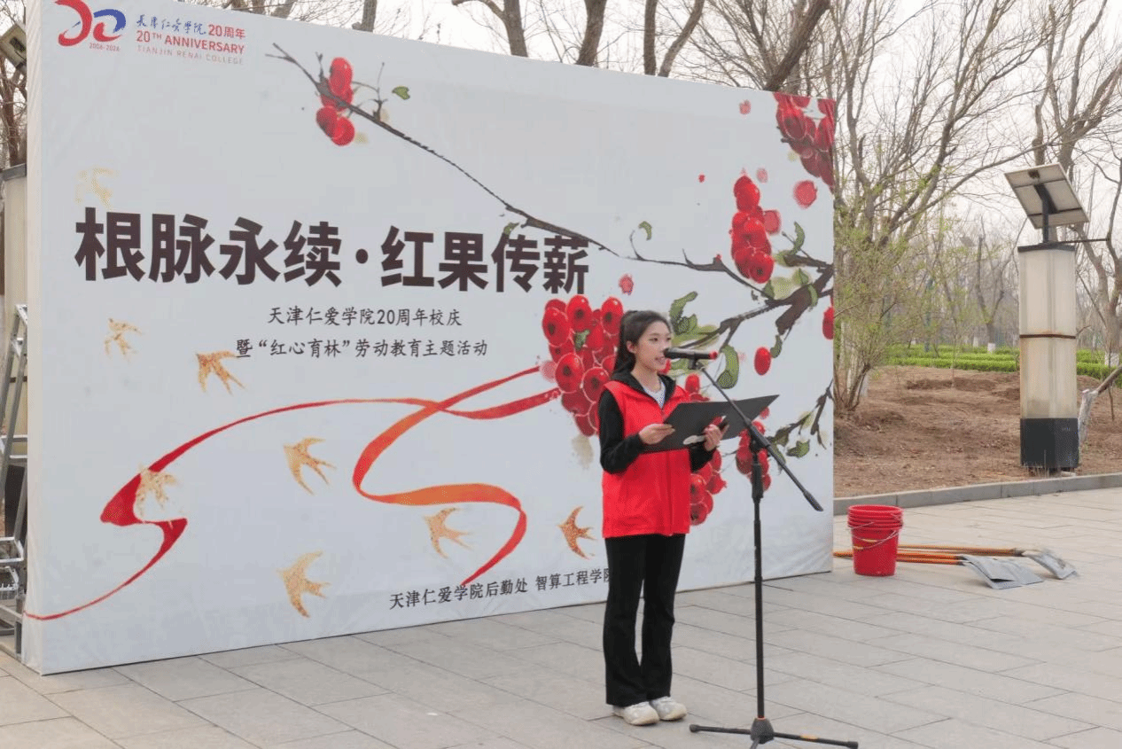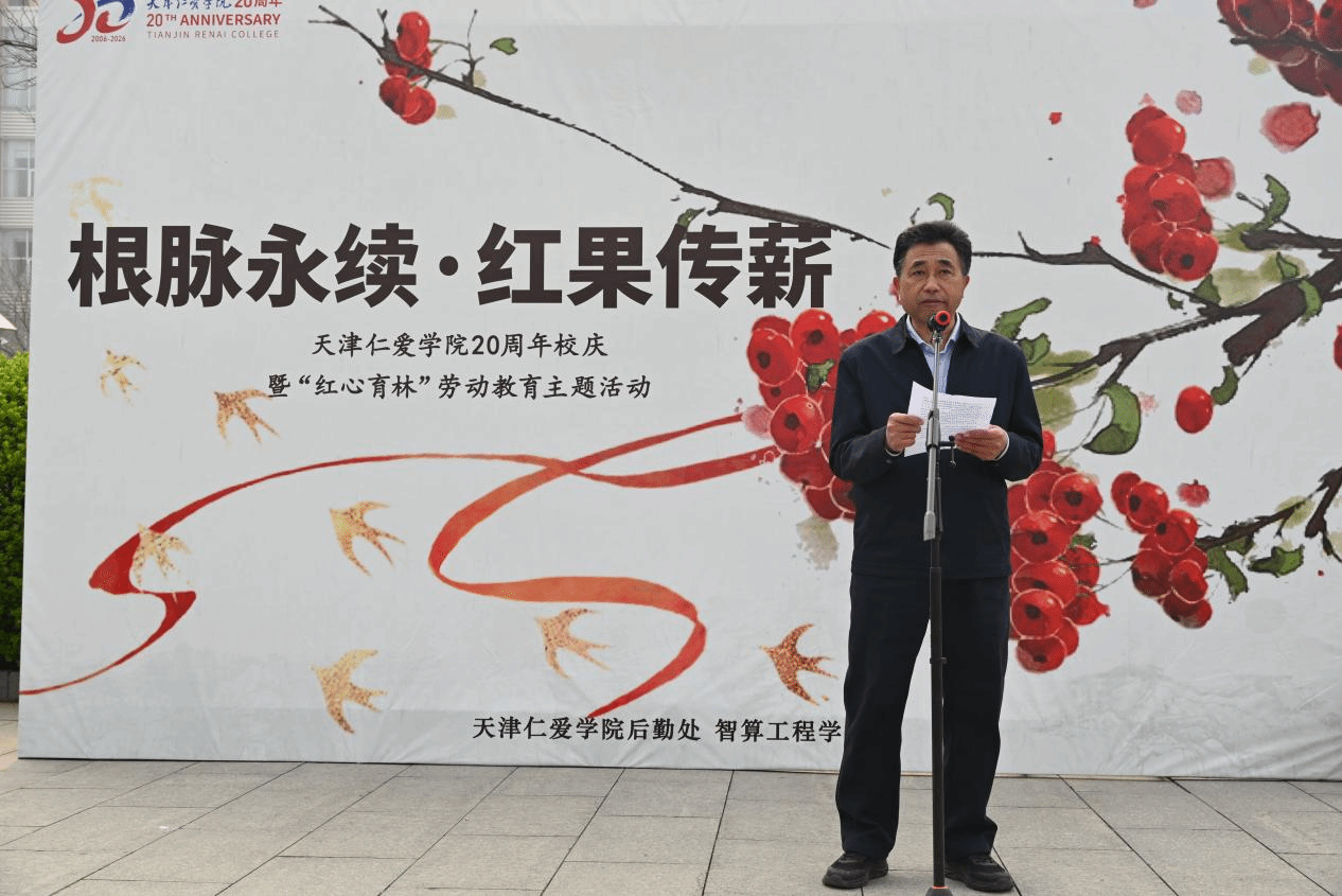 春风拂过校园,草木萌发,正是添绿的好时节。为深入贯彻习近平生态文明思想,践行“绿水青山就是金山银山”理念,将全民义务植树与新时代高校劳动教育落到实处,天津仁爱学院后勤处联合智算工程学院于3月29日隆重举行“根脉永续·红果传薪”——天津仁爱学院20周年校庆暨“红心育林”劳动教育主题活动,以植绿实践献礼校庆,以劳动初心涵养青年品格。