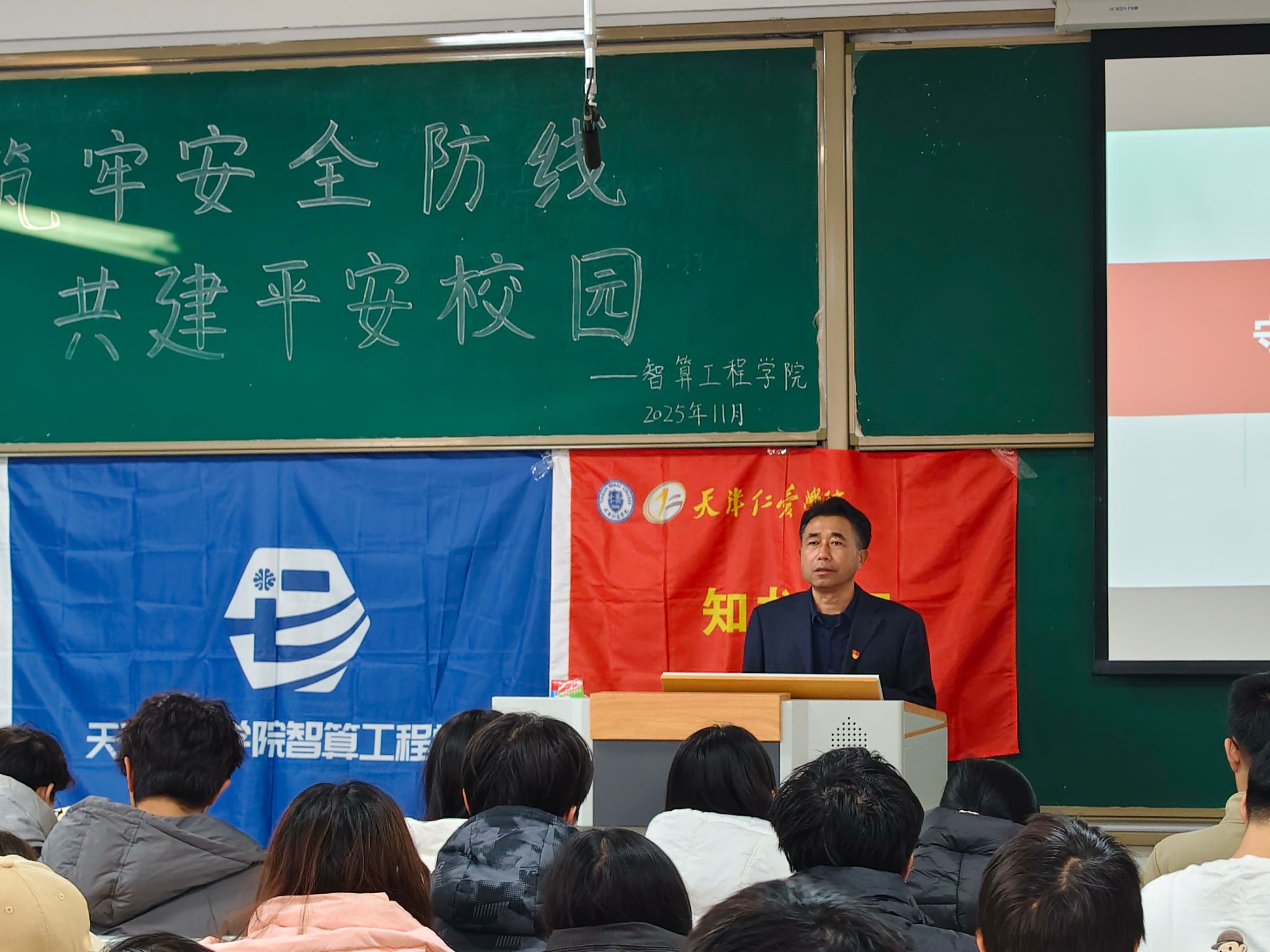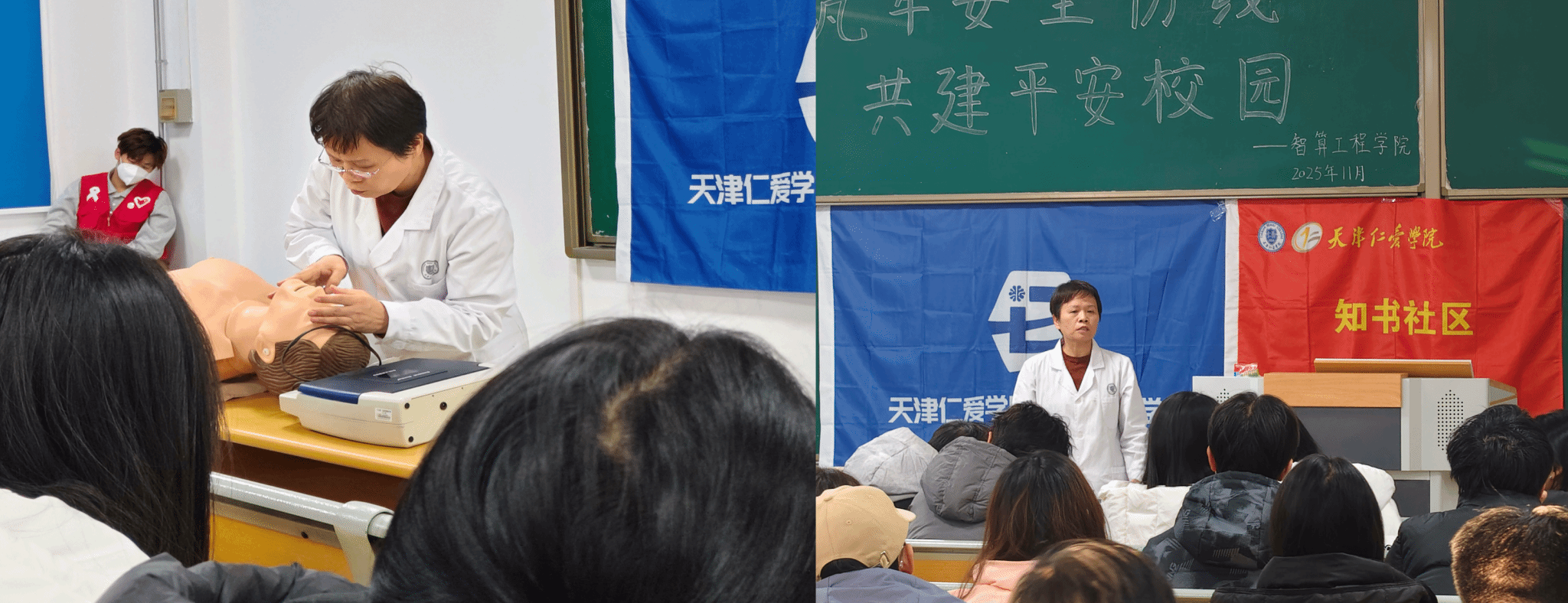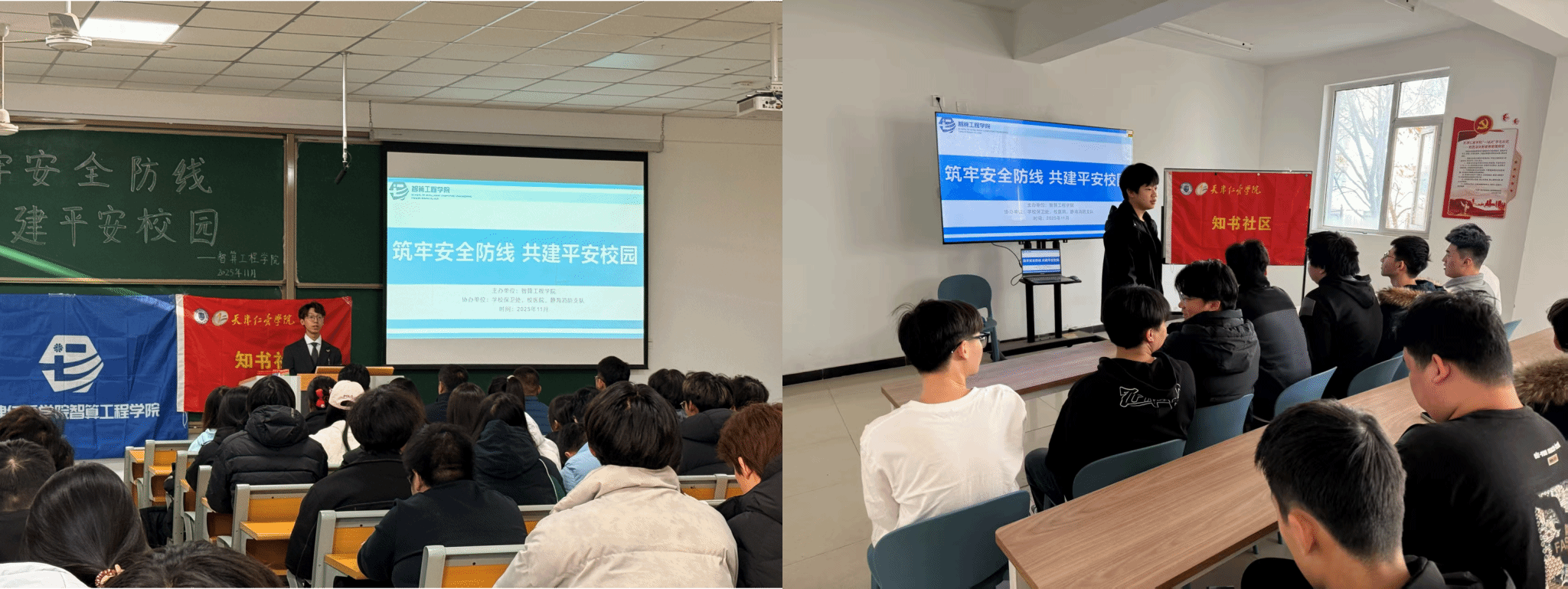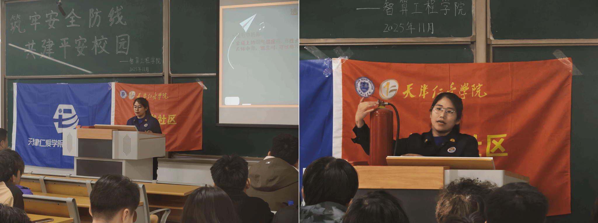 校园安全是教育事业的基石与生命线,为全面提升师生消防安全意识及应急处置技能,培育安全防护的良好习惯,2025年11月27日,知书社区携手静海消防支队、智算工程学院、校保卫处和后勤处医务室,在15宿党团活动室和2教102隆重举行“筑牢安全防线・共建平安校园”消防安全主题教育与应急演练活动。社区师生代表通过专题讲座与沉浸式实操相结合的形式,成功体验了一堂兼具理论深度与实践价值的“安全必修课”。
