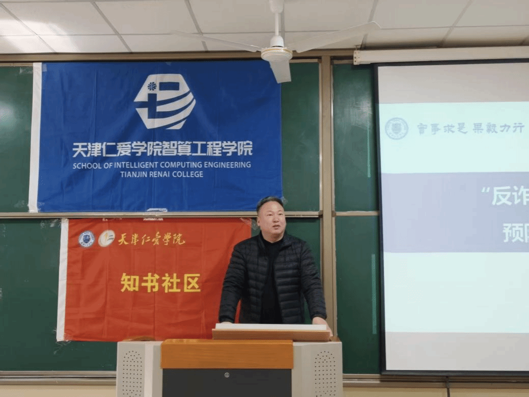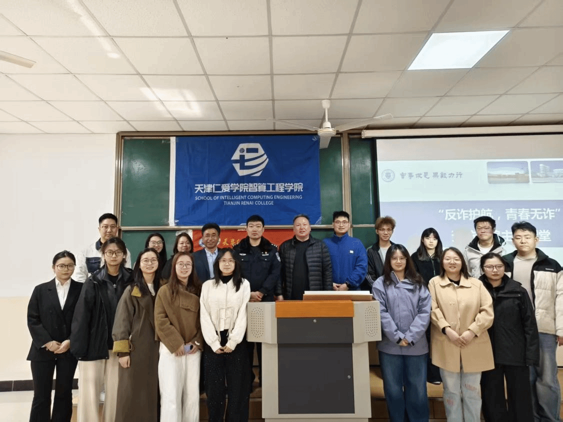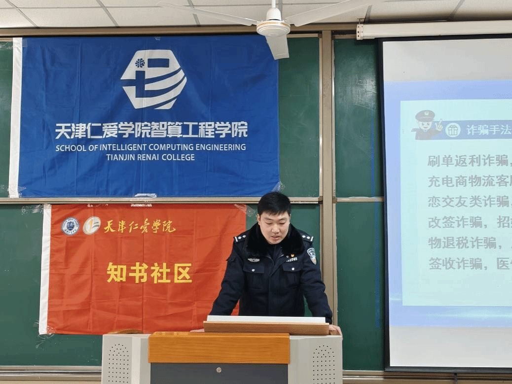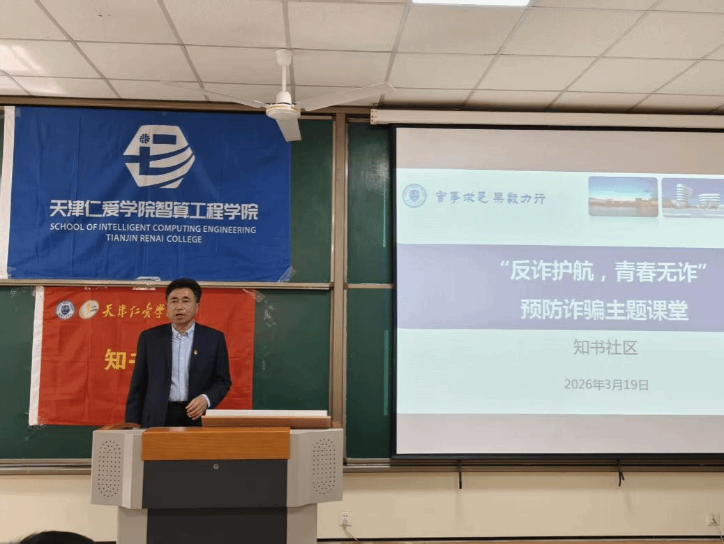 校园安全是教育事业的基石与生命线,为全面提升学生反诈防骗意识及自我保护能力,培育识诈拒诈的良好意识,2026年3月19日,天津仁爱学院知书社区携手智算工程学院、保卫处和团泊派出所,开展“反诈护航,青春无诈”预防诈骗主题教育活动。保卫处处长林宪用,团泊派出所民警窦占峰,知书社区副片区长、智算工程学院党总支书记花建锋,智算工程学院学生骨干参加了本次活动。